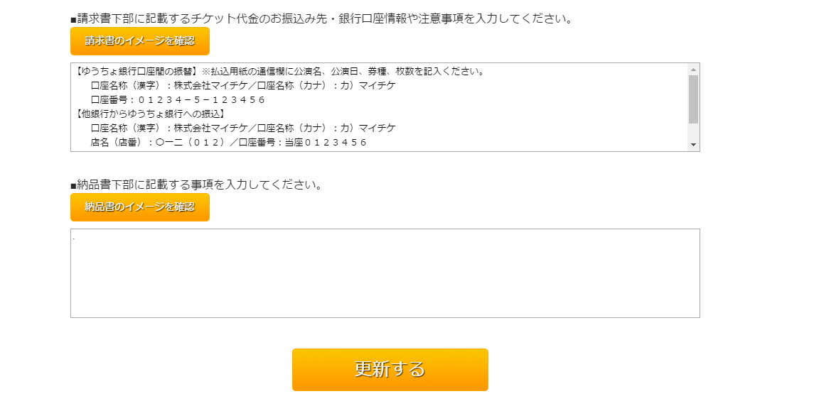 - マイチケを通さず、顧客にチケット代金を自分の口座に直接振り込んでもらう場合、請求書に口座情報を記載します。