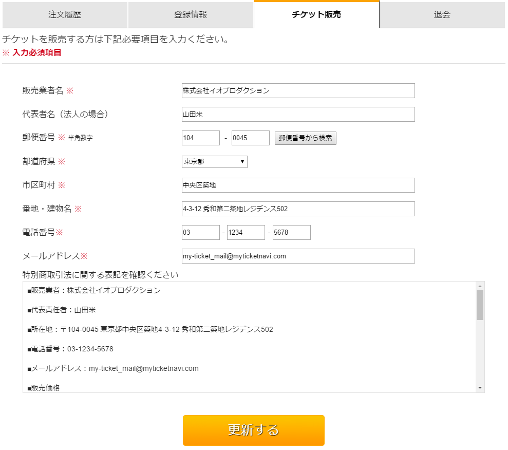 - WEB上でチケットを販売するにあたって、「販売業者」詳細、「特別商取引法に基づく表示」を作成します。