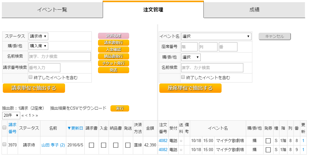 各座席の左のチェックボックスにチェックを入れて、キャンセル処理、あるいはCSVで抽出情報をダウンロードします。