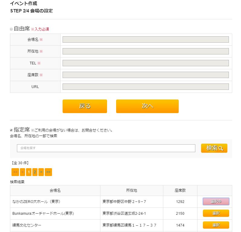 - イベント会場の住所を入力します。指定席の場合は指定席の横にチェックを入れて、ホールを検索、選択します。