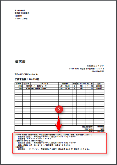 自分の銀行口座の表示がない場合は、ヘルプ「1.チケット販売の準備」を確認ください。この請求書は、三つ折りすると窓枠付き封筒に住所が表示されるデザインです。